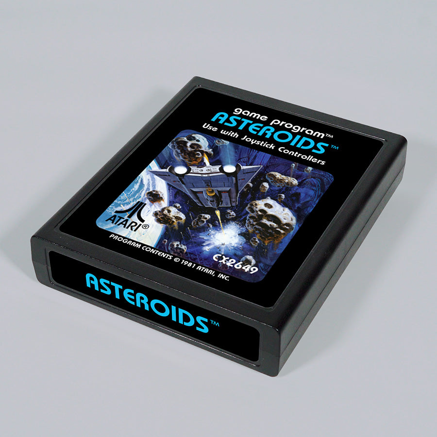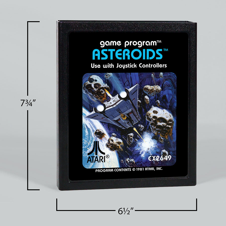 A GIANT asteroid is heading your way! This oversized cartridge is a replica of the original Asteroids 2600 game cartridge, perfect to display on your desk or game shelf. Replica only, not playable.