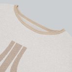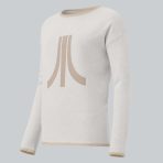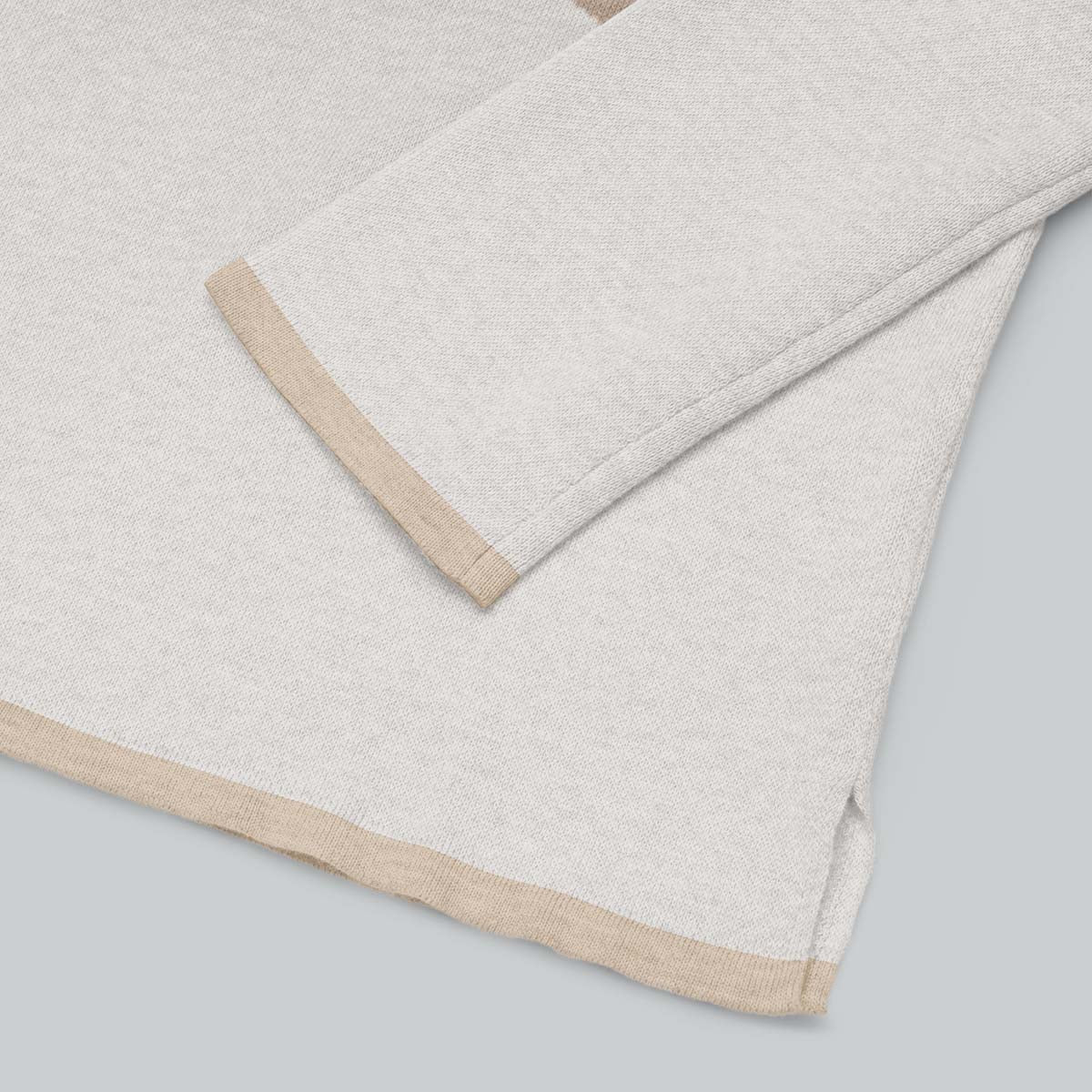 A light, casual sweater — perfect for cold mornings. Cocoa-colored edging and Fuji on a bone-colored jacquard knit.