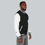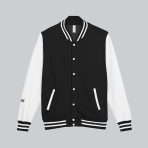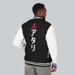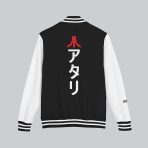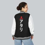 A classic heavyweight letterman jacket in white and jet black, featuring the Atari Katakana logo on the back and a low-key “Atari” on the sleeve.
