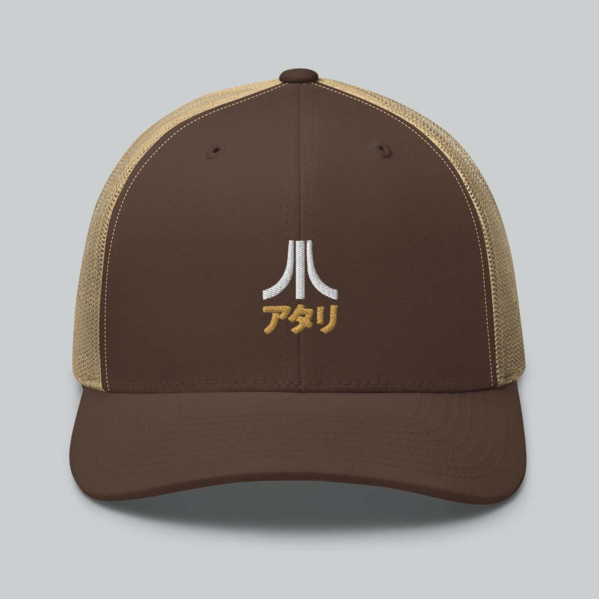 Grab this structured Katakana logo trucker cap in one of three natural color combos: Moss & Khaki, and Brown & Khaki.