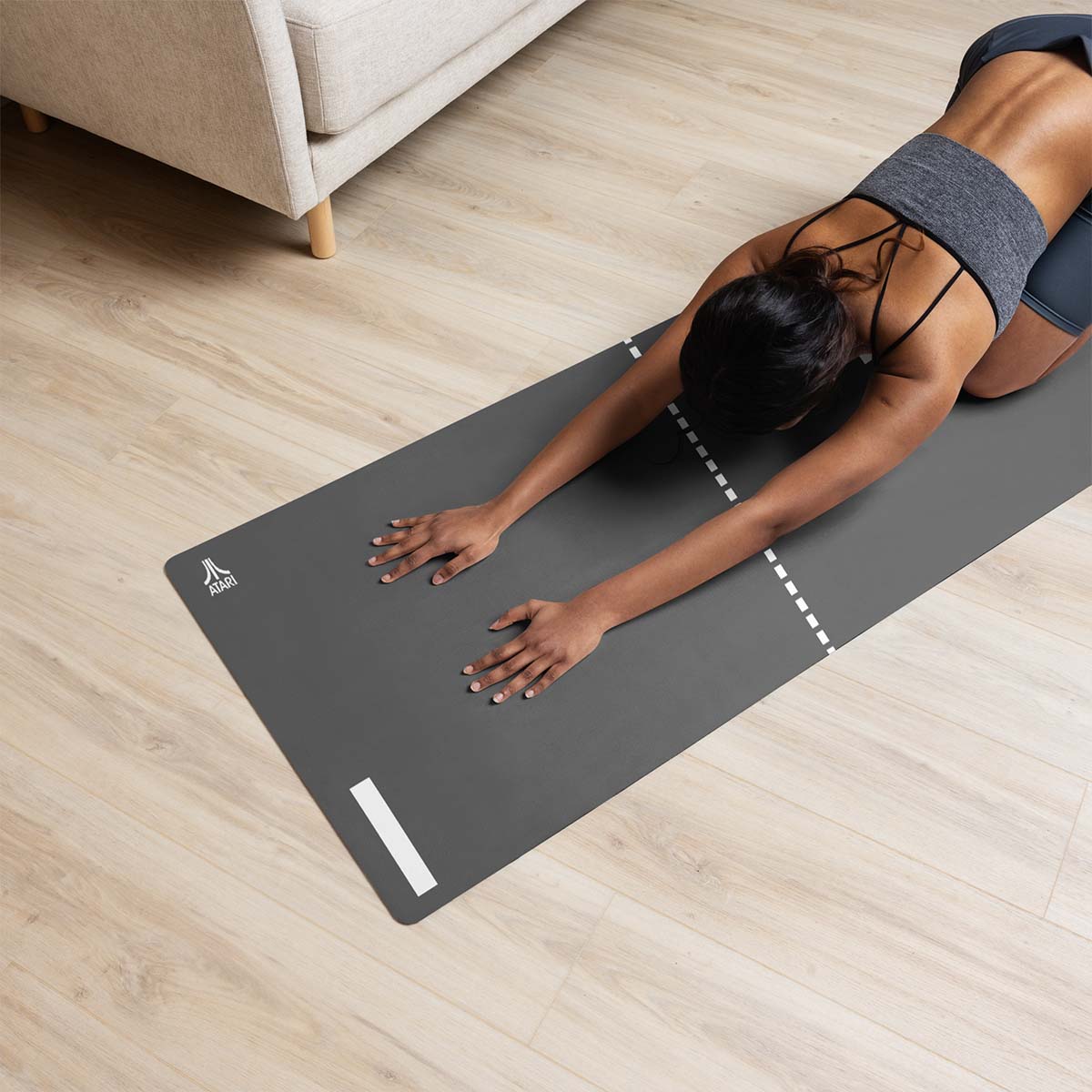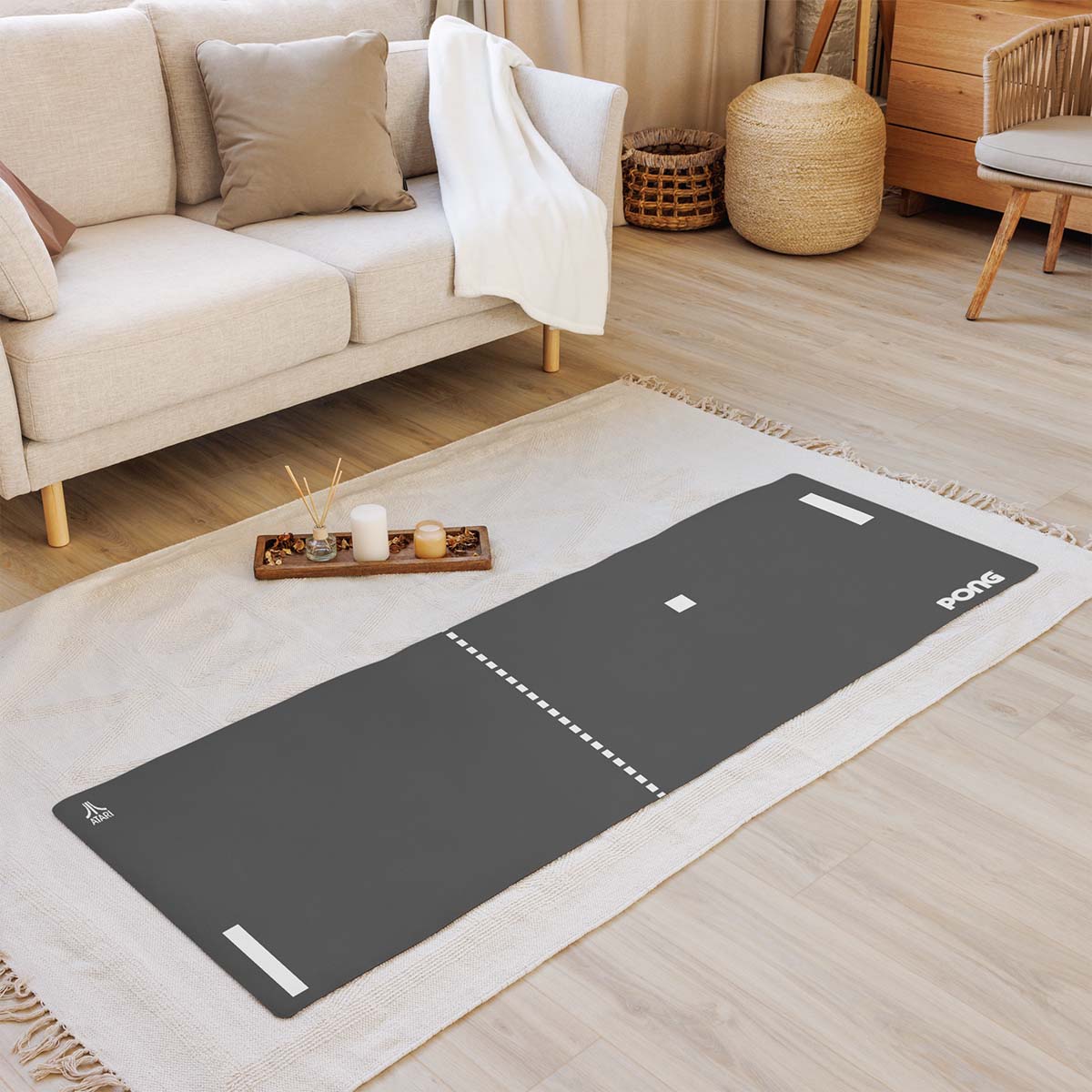 Bring balance to your practice — even on a long drive, pit stops double as a chance to take some poses. This 24" x 68" rubber yoga mat has a microsuede surface and features PONG, the OG Atari video game. Material: Microsuede top/rubber bottom
