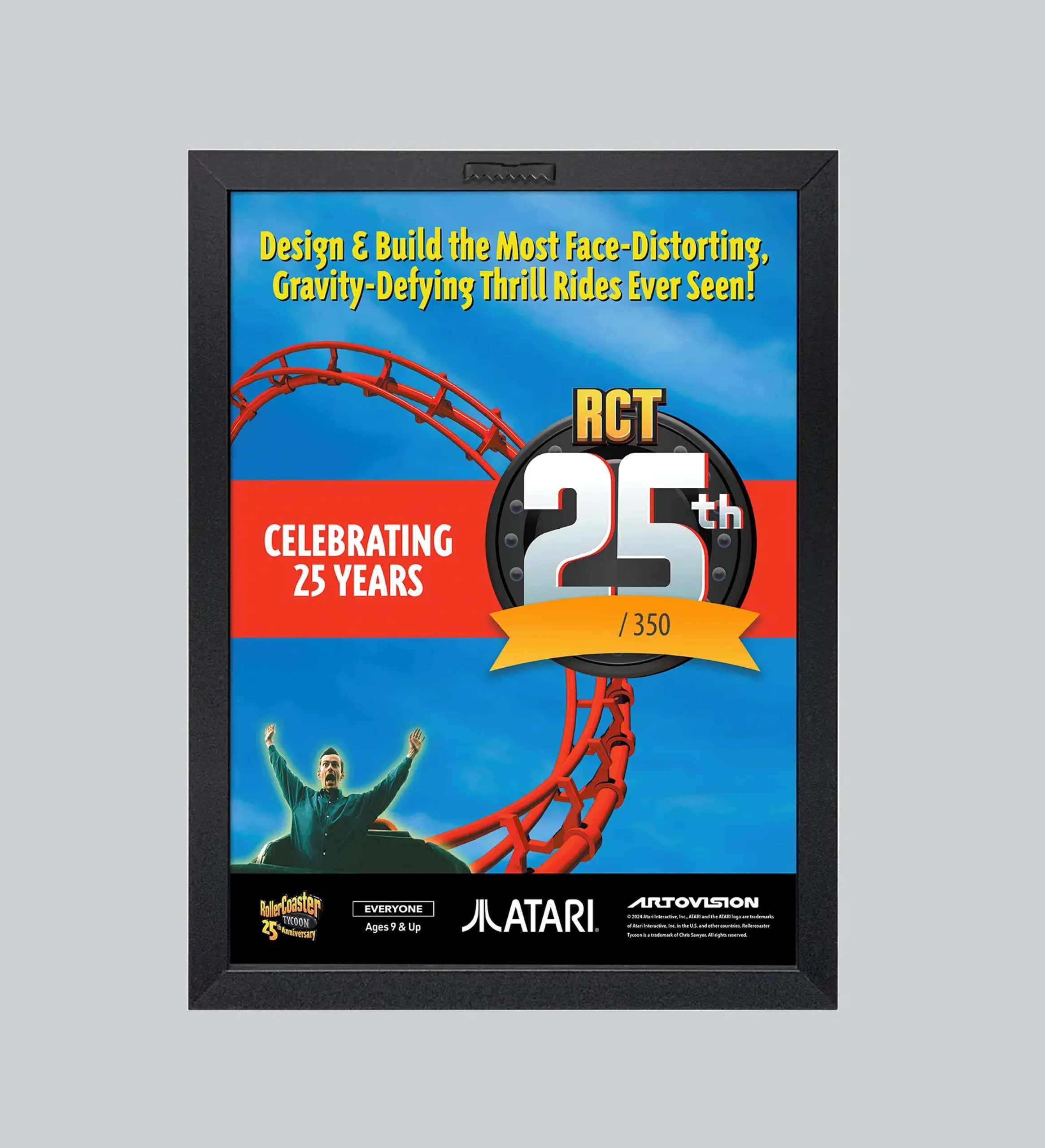 - Offered in a limited numbered edition of 350, each art piece has been hand-signed by RollerCoaster Tycoon creator Chris Sawyer and comes encased within. This collectible shadowbox art piece measures 12″ x 15 1/2″ x 2 1/2″ and comes ready to hang with an official Atari Certificate of Authenticity (COA).