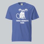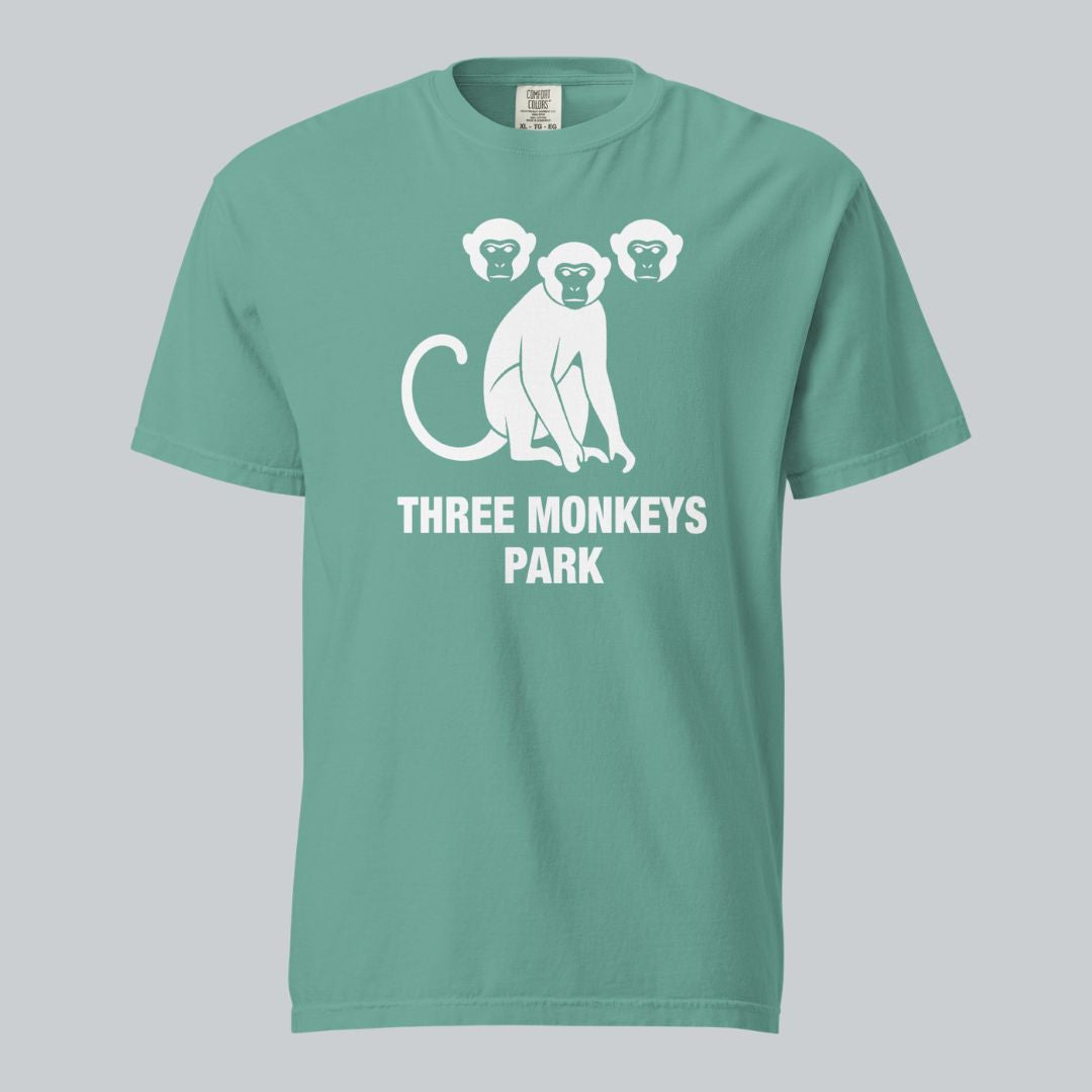 The official shirt for peeps who love to monkey around. Our comfiest tee in blue or seafoam green with a white Three Monkeys Park graphic.