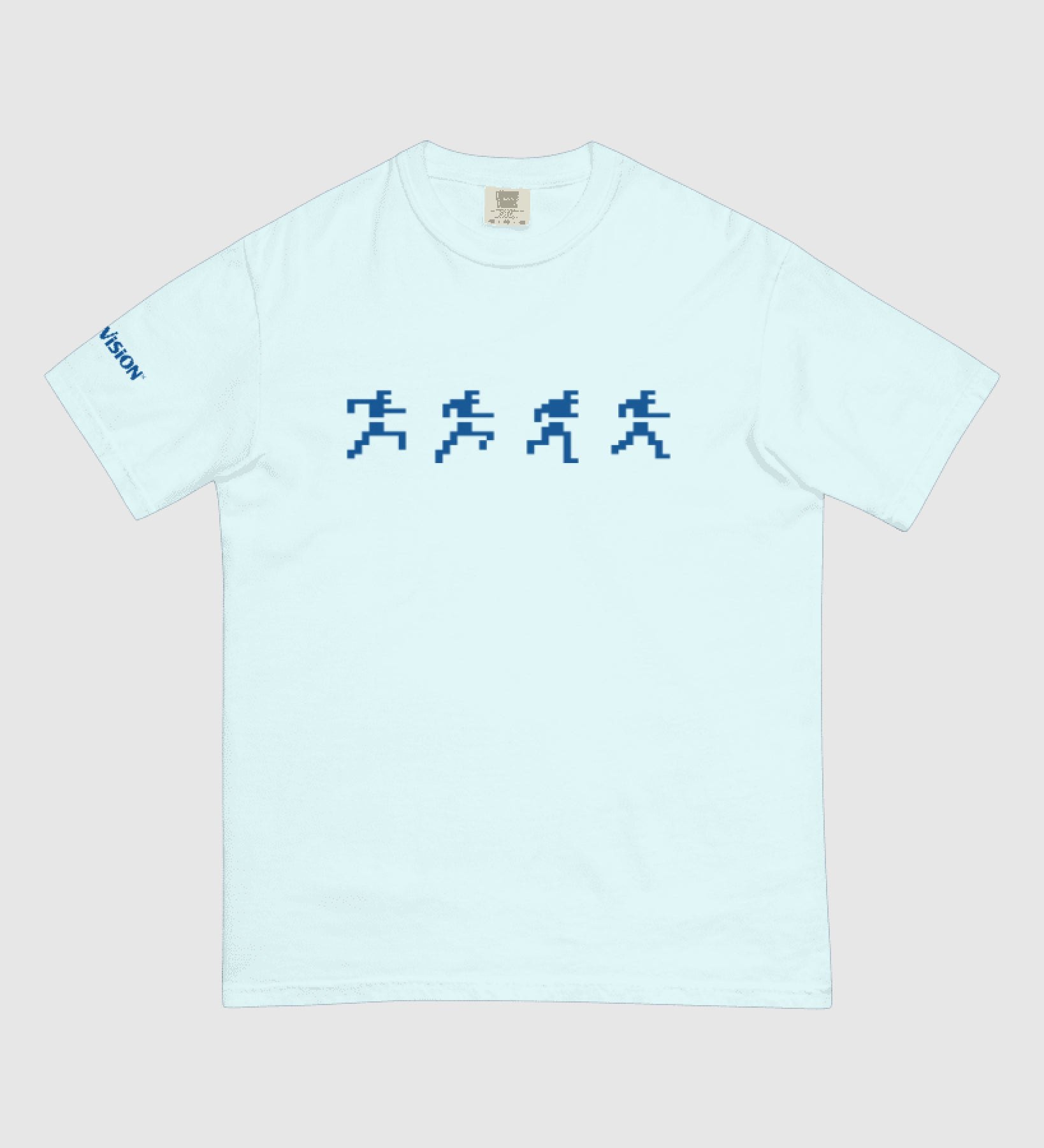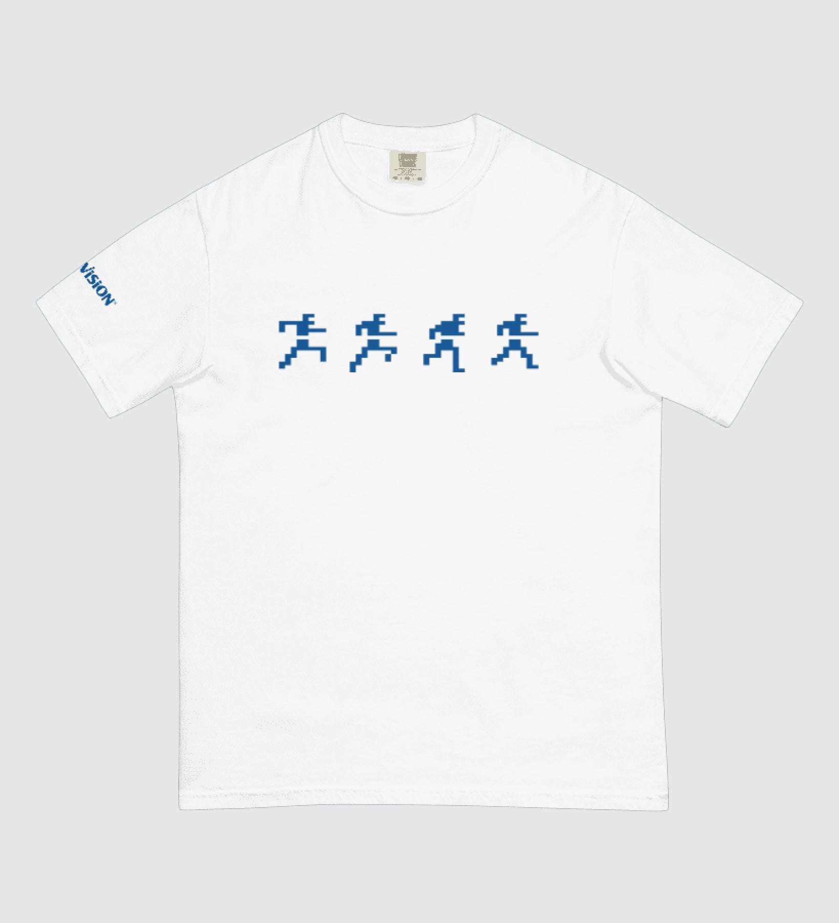 The symbol and spirit of Intellivision, the running man’s multiple poses reinforced the brand’s competitive advantadge in sports games. On White or Sea Battle Blue with the the intellivision mark on the sleeve. Premium, heavyweight cotton that offers a structured yet comfortable fit.
