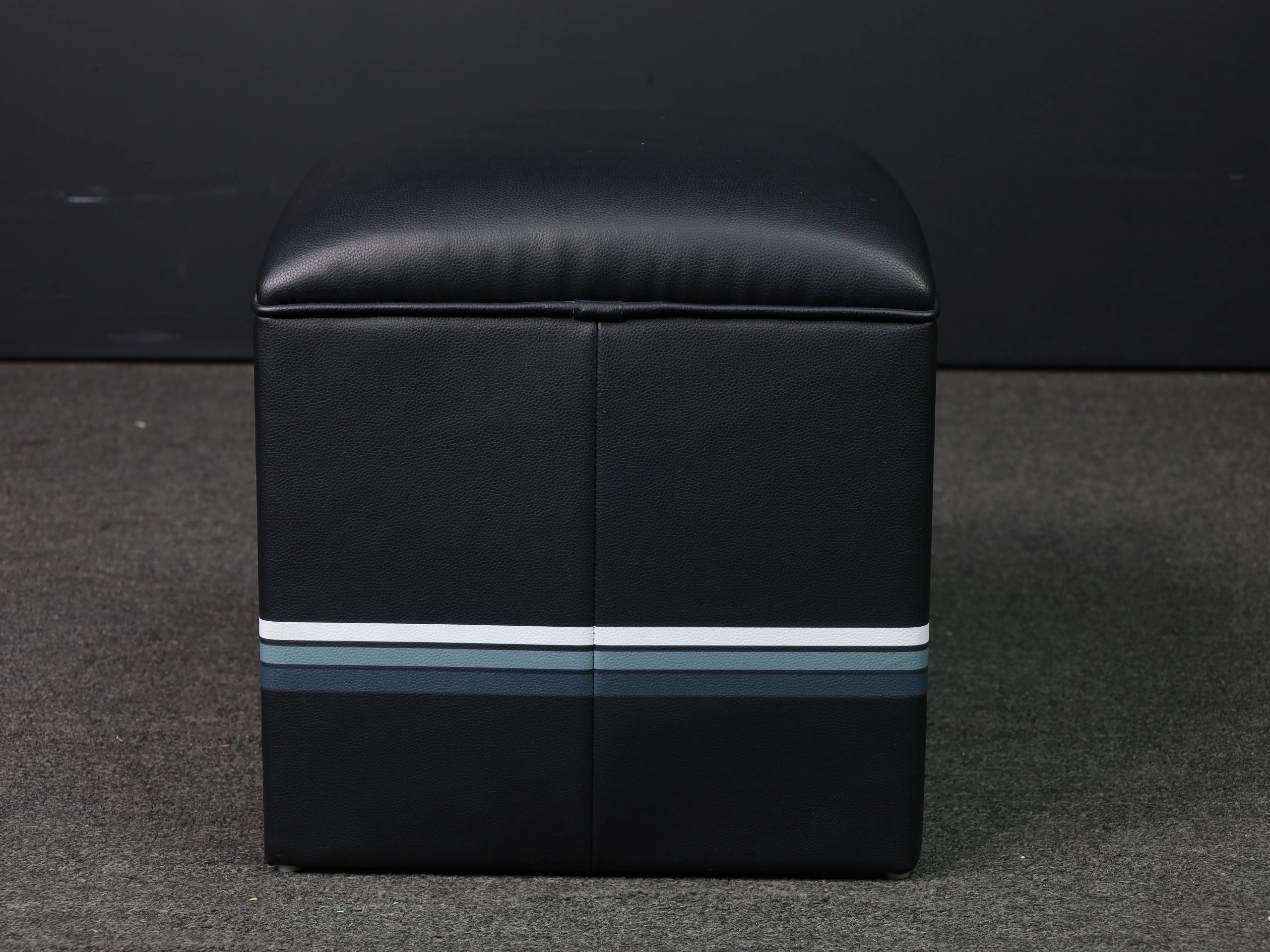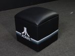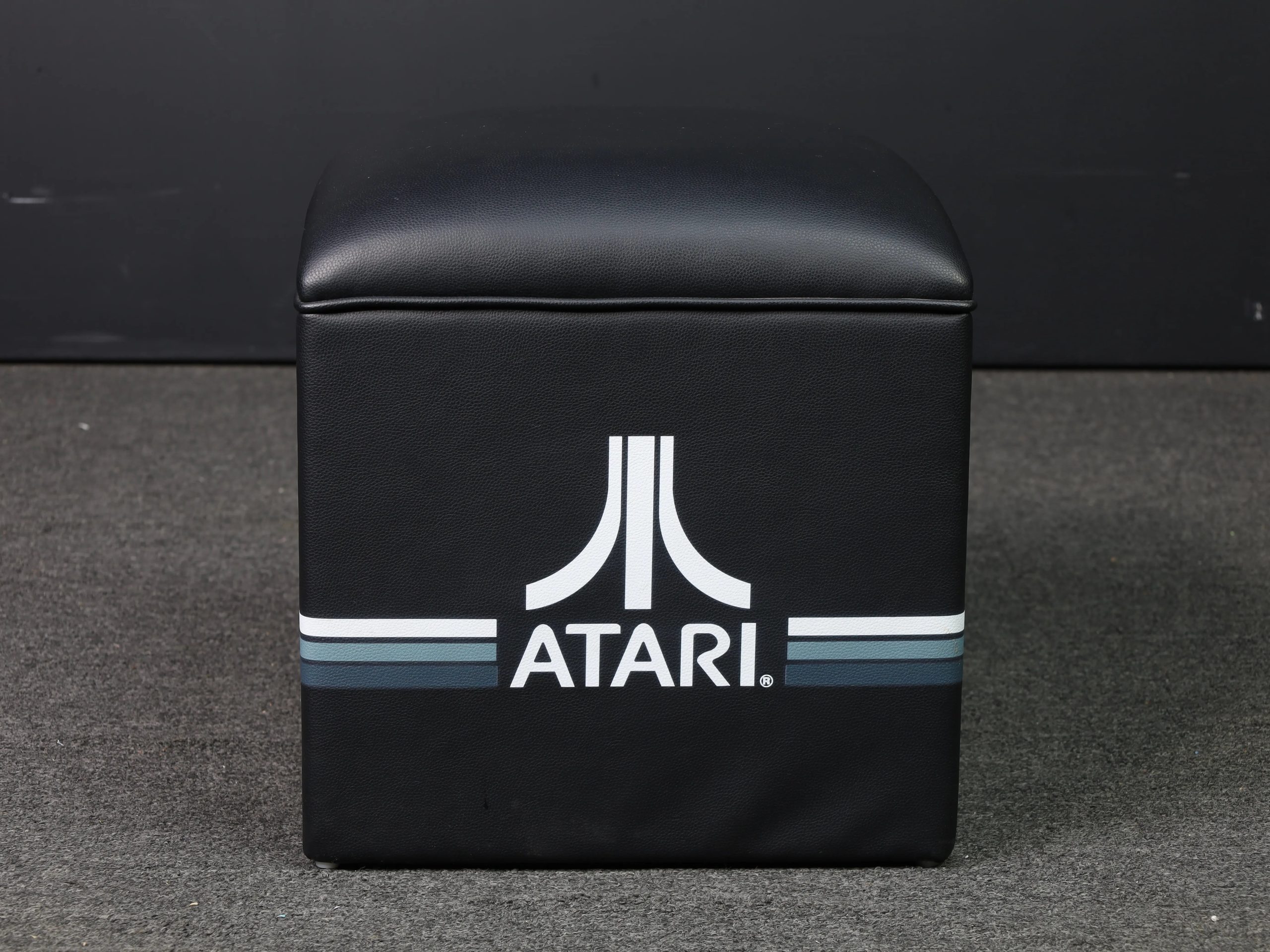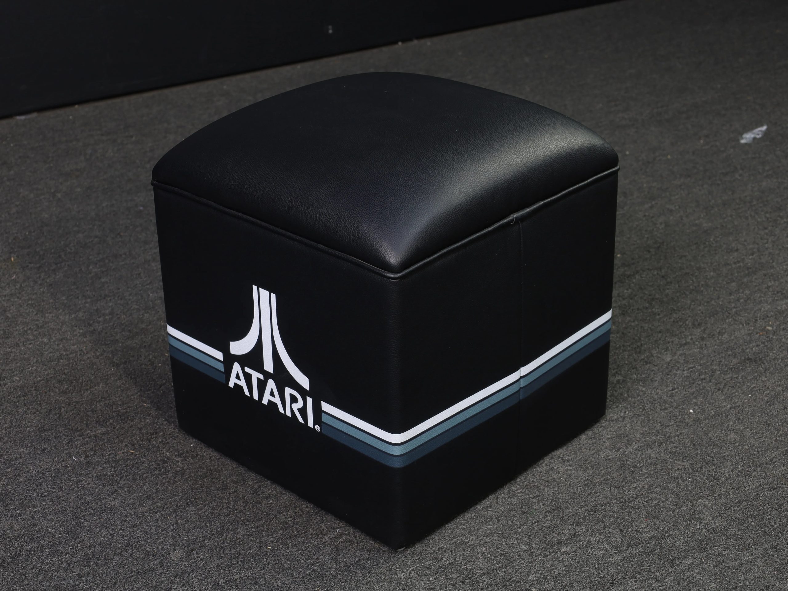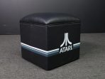 These 2 padded stools were designed to pair with the PONG Mechanical Coffee Table from Alan-1. Each stool matches the design of the coffee table with an Atari logo and the monochrome stripe. 16” W x 16” D x 17” H.
