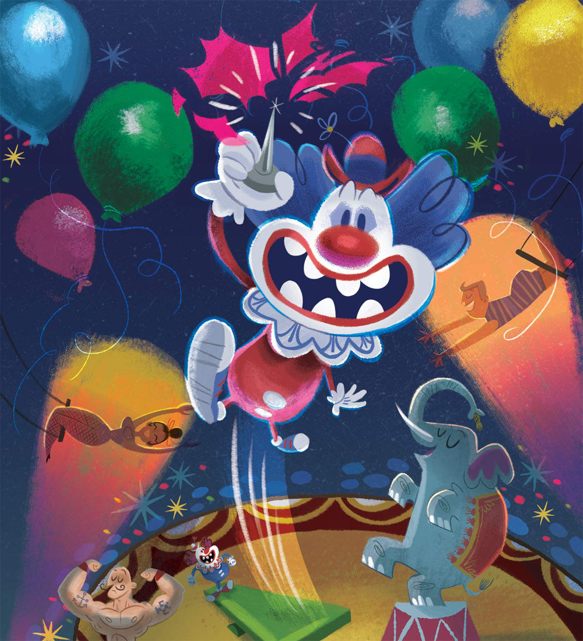 Step right up to see high-flying stunts and daring deeds as acrobatic clowns Blip and Boing take center stage at the circus! You control the teeter-totter that launches these two daredevil clowns into a moving cloud of balloons. Beware! When your clowns miss the teeter-totter, they crash with a SPLAT! As they fly into the air, they pop every balloon they touch, scoring you points and astounding the audience. Will you earn a standing ovation with your death-defying performance? Or will your stunts fall on their face?! The game even includes a fun, simultaneous 2-Player mode, where you and a friend can try to bounce clowns on screen at the same time.